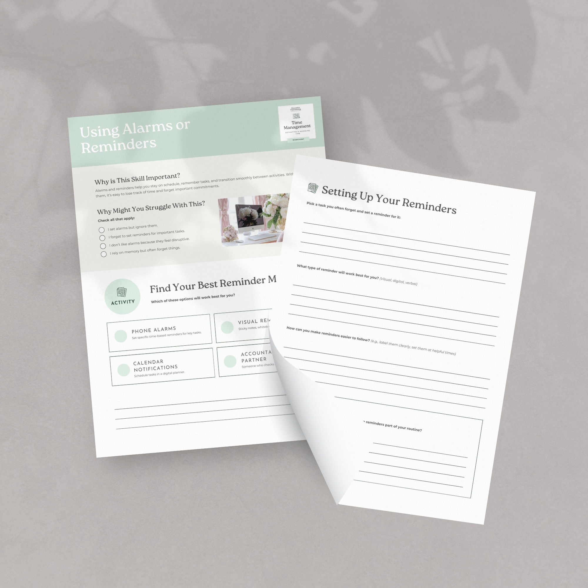 Using alarms or reminders – Executive Function worksheet